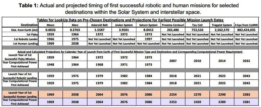 В документе прогнозируются самые ранние возможные даты запуска миссий с экипажем из около-лунного пространства в выбранные места Солнечной системы и даты межзвездных полетов.