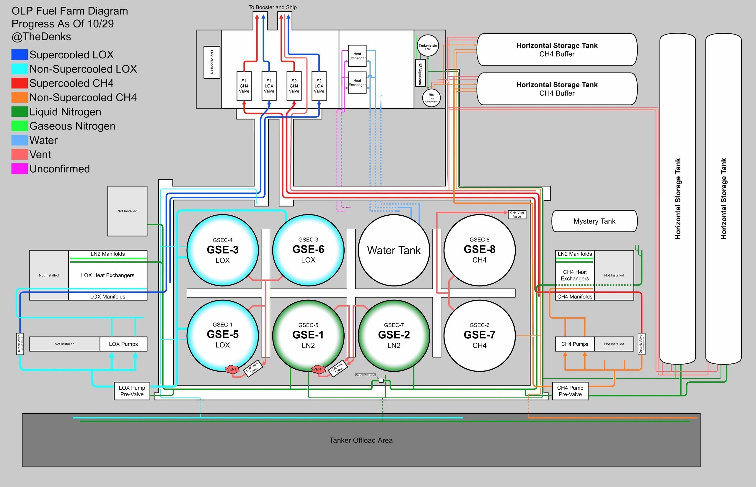 Первый резервуарный парк орбитального класса Starbase, состоящий из семи гигантских резервуаров, изготовленных по индивидуальному заказу, последний из которых был установлен и «закрыт» в середине октября, немного похож на систему кровообращения площадки и будет хранить, охлаждать и распределять всё топливо, необходимое для запуска ракеты. Для поддержки Starship и Super Heavy, самой большой отдельной ступени ракеты и самой большой интегрированной когда-либо построенной ракеты, ее стартовая площадка и резервуарный парк должны быть одинаково огромными. В классическом стиле SpaceX компания стремилась сохранить низкие затраты на резервуарный парк и высокую скорость строительства, в результате чего была получена довольно уникальная установка с точки зрения стартовых площадок.