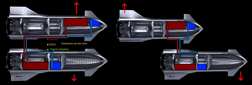Отметим для начала их центры тяжести, на основании их, определим место ЦМ. Он разместится в центре грузового отсека танкера. При размещении топливной емкости ближе к носу (там есть еще одна, для посадочного бака с кислородом), танкер сможет выгружать первые партии полностью. Для Луны Маск заявил, что достаточно 6 заправок (половина баков), тогда этот вариант полностью обслужит КА, а вот для Марса нужна полная.  Мои расчеты брать в расчет не обязательно, они визуальны и просчитаны на счетах))). Вероятность заполнения баков до полного объема есть, но очень мала. Попробуем танкер отодвинуть дальше от КА, то и бак так же отдалится от него, выигрыша нет.