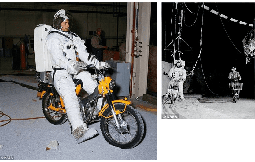 В конце 60-х инженеры NASA всерьёз рассматривали разные варианты транспорта для астронавтов лунных миссий. Основной расчёт был на лунные автомобили (лунные багги, LRV) но вариант электро-байка рассматривался как запасной.