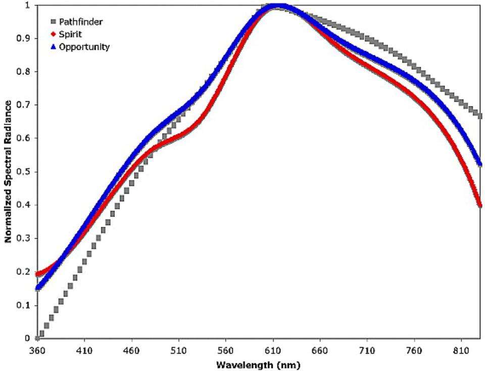 Для атмосферы Земли характерно преобладания такого явления как рассеяние Рэлея, которое объясняет доминирование синего и голубого оттенков. Атмосфера Марса намного разреженнее и тоньше (плотность атмосферы составляет 0.7% от земной), и доминирующей силой здесь выступает количество пыли, что в итоге приводит к :