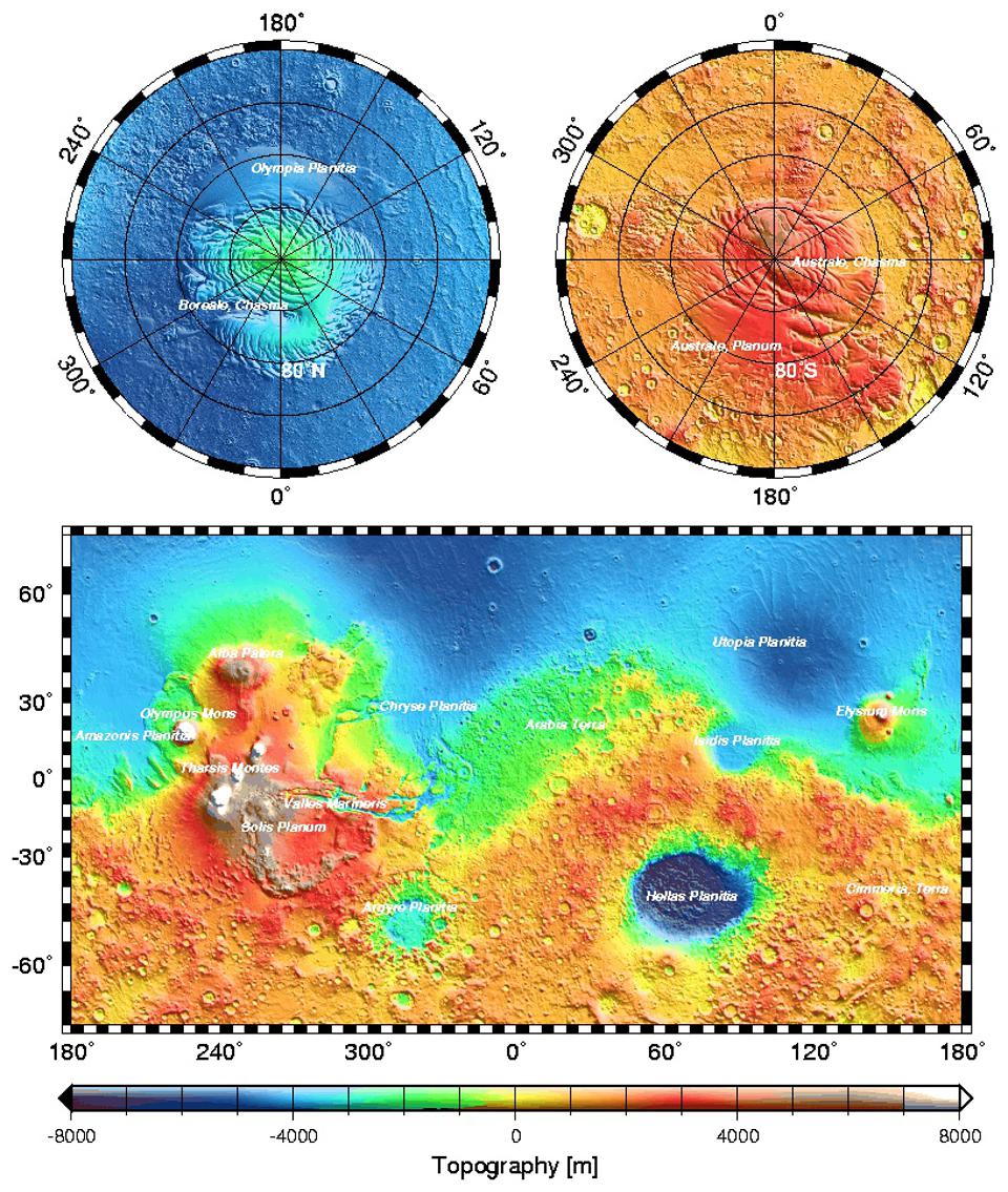 С другой стороны, топографическая карта Марса подсказывает нам, что высота красной планеты интересным образом варьируется, и это лишь частично коррелирует с обилием оксидов железа. Преимущественно южное полушарие находится на гораздо большей высоте, чем низменности на севере. Наибольшие “подъёмы” происходят в богатом оксидами железа регионе Tharsis , в низинах же к востоку от него содержание оксидов железа резко падает.