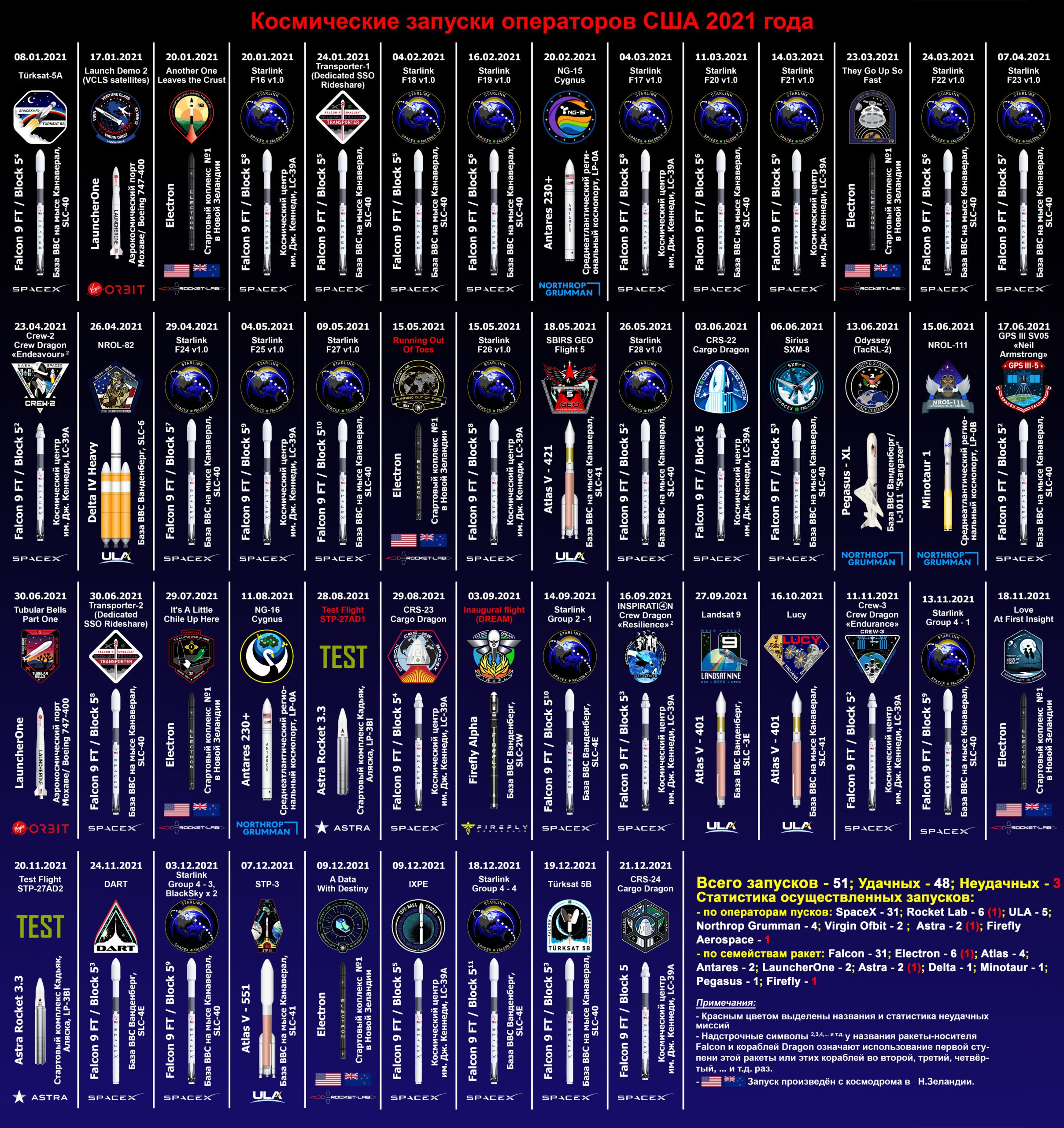 Космические запуски операторов США 2021 года Петр Бушинский Січ 18, 2022 Інфографіка 110 1 Share Telegram Twitter/X Facebook WhatsApp Copy Link