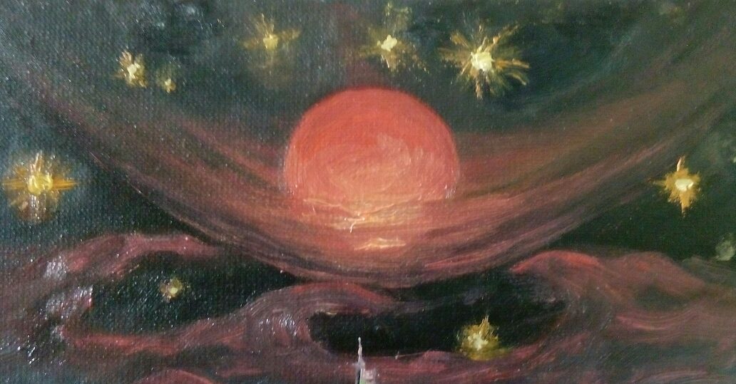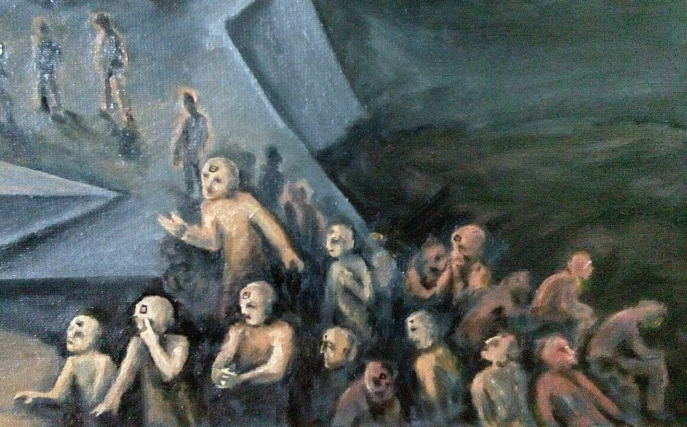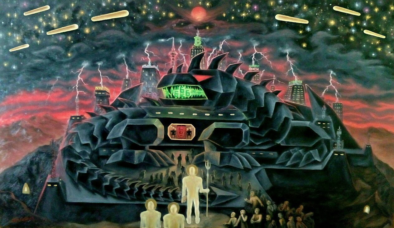 И на фоне этой картины идет борьба технократического тоталитарного режима с его противниками, а с неба спускается город… В довершение ко всему прилетают инопланетяне и  эвакуируют часть людей. Наверняка вы все это уже видели в десятках фантастических фильмах и читали в книгах, но мне очень нравится как этот сюжет обобщен в одном единственном произведении. Вдохновившись им, я нарисовал эту картину. Называется Судный День . Масло, холст, 140х60см