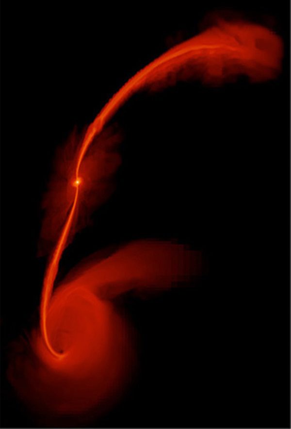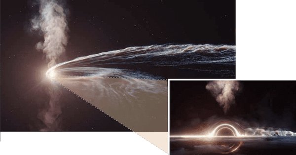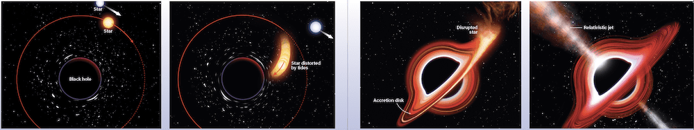 Что же происходит потом? «Половина вещества звезды падает на чёрную дыру, образуя вокруг неё аккреционный диск, — объясняет Рамирес-Руис, — а половина выбрасывается». Вещество, из которого состоит диск, притягивается чёрной дырой и питает её. В ходе этого процесса способная возникнуть вспышка, которую можно наблюдать на огромном расстоянии, прежде чем она ускользнёт за горизонт событий чёрной дыры (откуда свет уже более не способен выбраться).