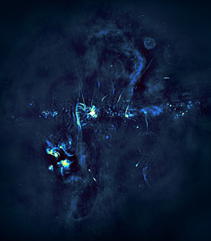 Наконец, изображение, полученное с помощью MeerKAT, загружается на мой ноутбук. Я делаю паузу, чтобы осмотреть его целиком — на мгновение кажется, будто паришь в пространстве — до того, как увеличиваешь масштаб. А там… Пятно света в центре — вспышка умирающей звезды, остатки которой поглощает чёрная дыра, одиноко парящая посреди космического океана.