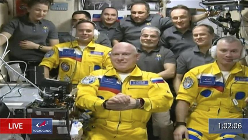Три российских космонавта, только что пристыковавшиеся к Международной космической станции, прибыли в украинском желтом!