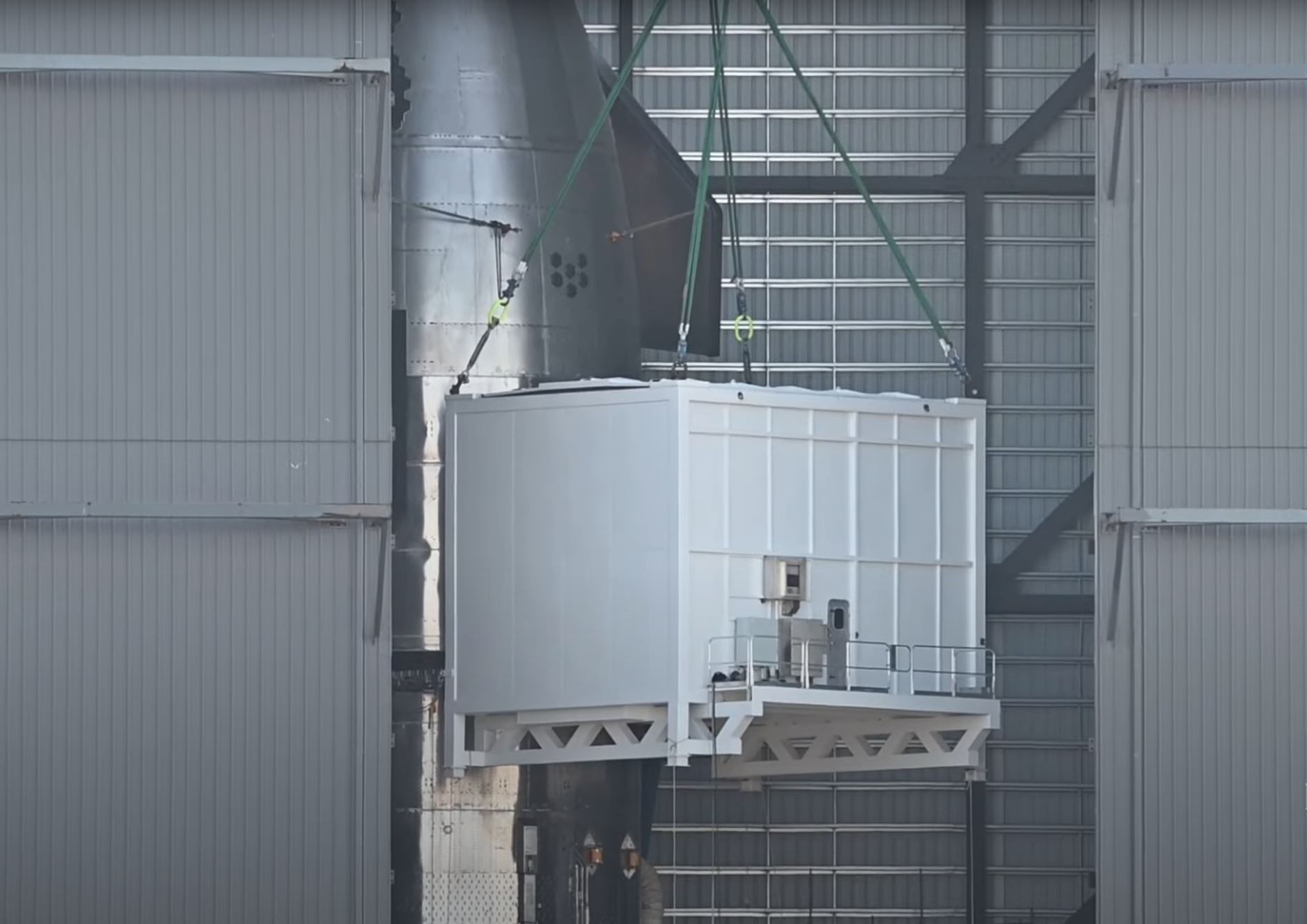 Лопнувшую в конце мая трубку быстро заменили, как и отлетевшие плитки. Теперь он находится в High Bay, где докладывают оставшуюся плитку и устанавливают двигатели. В конце месяца примеряли загрузчик полезной нагрузки – строившуюся с конца апреля металлическую конструкцию, назначение которой доподлинно прояснилось лишь в конце прошедшего месяца. Ее подняли краном и, вероятно, примерили, как осуществлять к перегрузку Starlink v2 из коробки в корабль.