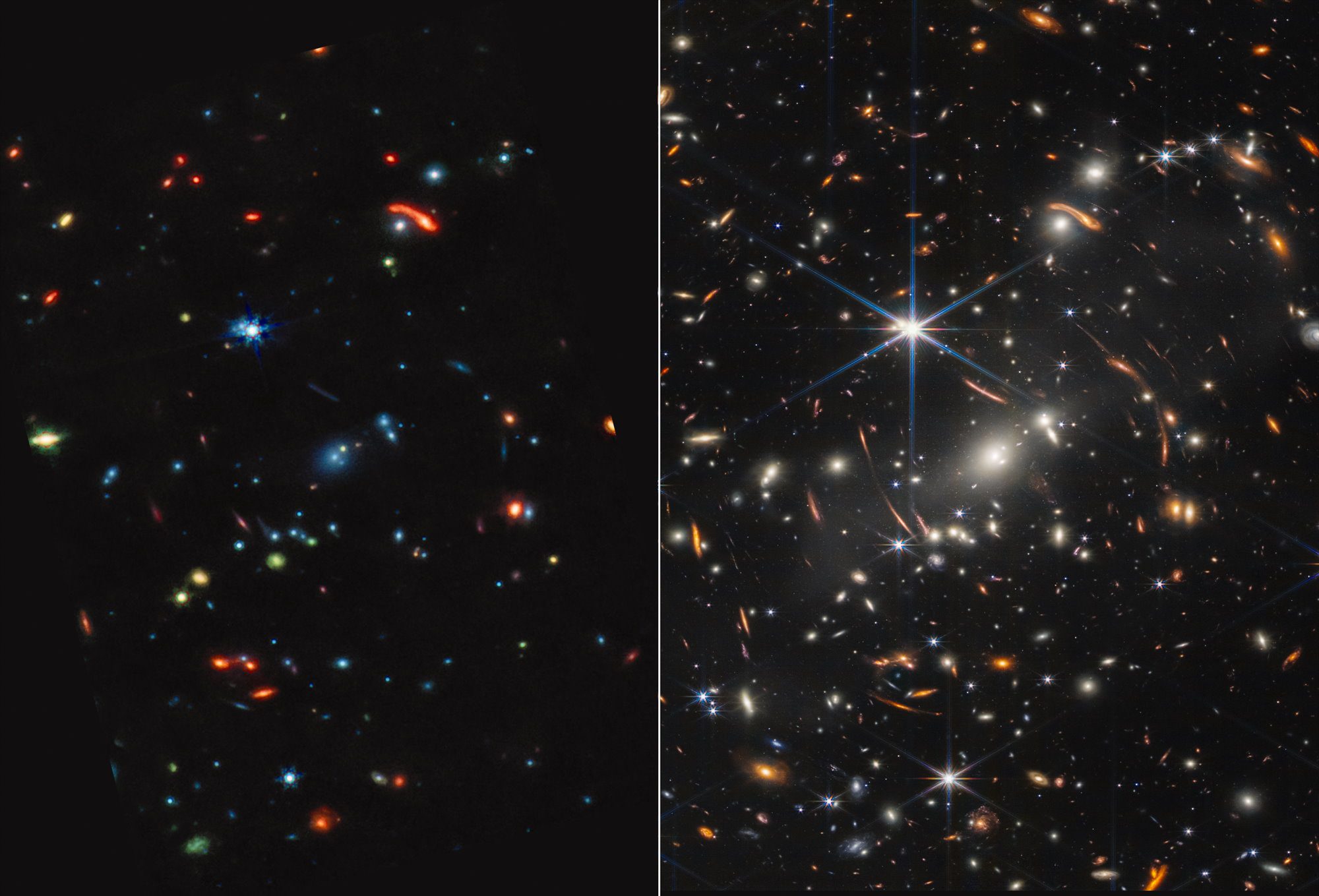 Прибор MIRI раскрыл иные детали. При помощи этого инструмента удалось разглядеть, какие галактики богаты космической пылью (они имеют красный цвет), а какие нет (голубоватые). Кроме того, на изображении MIRI видны зеленоватые галактики, богатые углеводородами. Исследователи смогут использовать подобные данные, чтобы лучше понять процессы формирования, роста и слияния галактик, а также звездообразования в них.