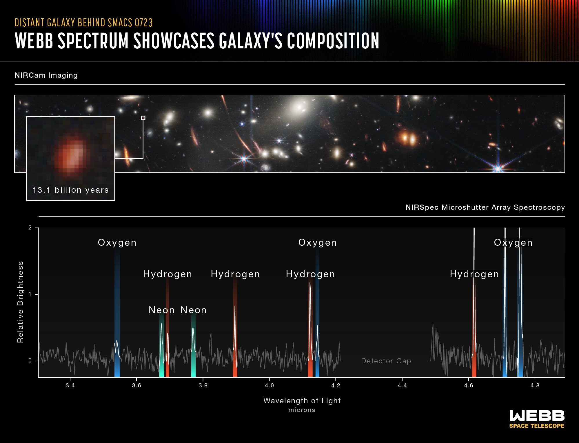 В дополнению к этой паре изображений, JWST удалось изучить свет от галактики, расположенной на расстоянии 13,1 миллиарда световых лет. Это стало возможным благодаря инструменту NIRSpec, который смог пронаблюдать 48 отдельных галактик одновременно.