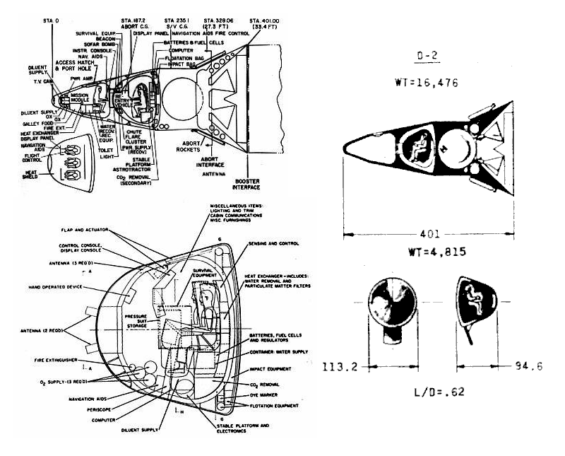 Спускаємий апарат D-2 мав форму фари: напівсфера в носовій частині, яка переходить в усічений конус з кутом 7 градусів, і класичний тепловий екран у формі сегменту сфери у кормі. Це був розвиток дзвіноподібної форми спускаємого апарату від McDonnell.