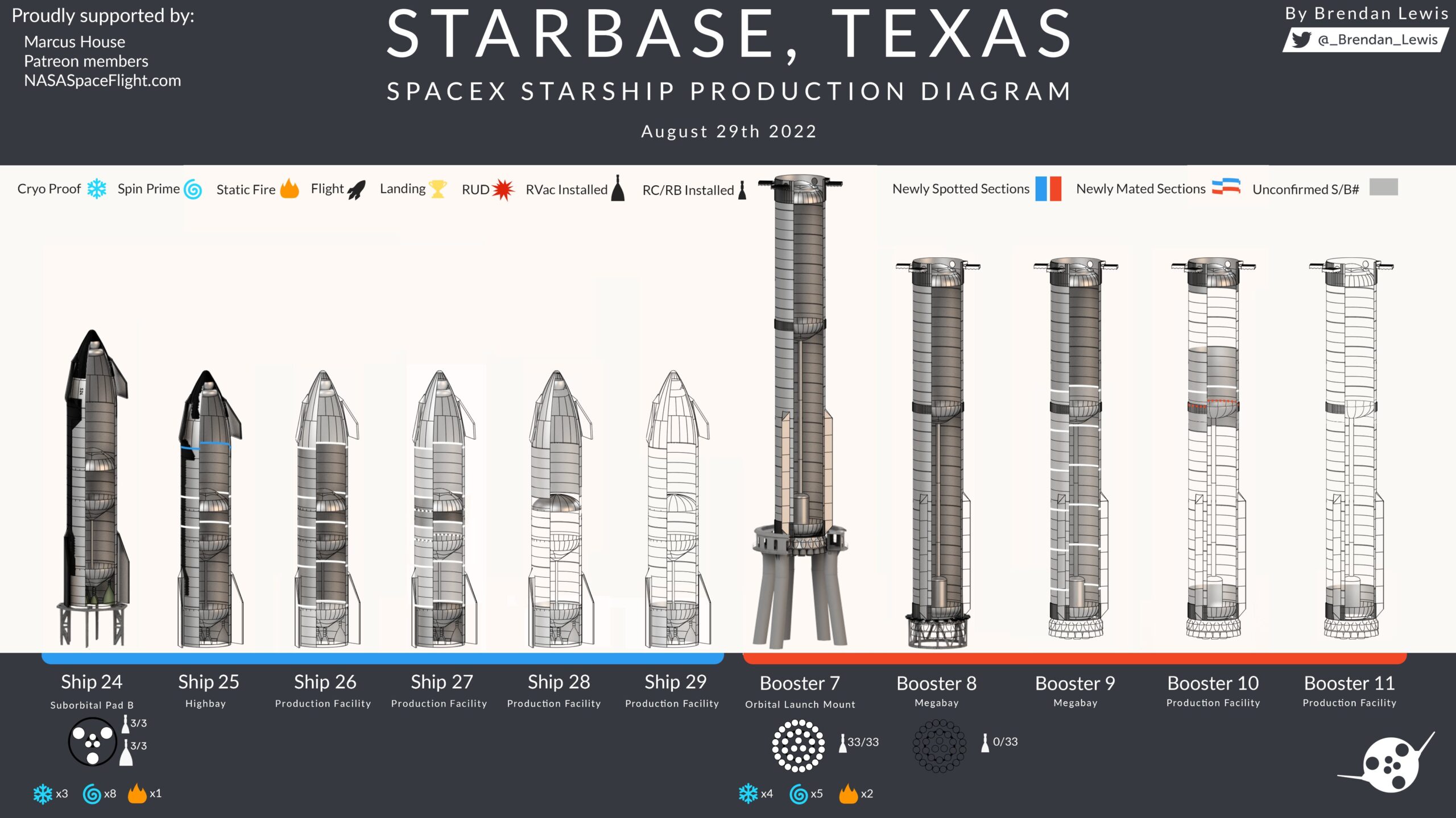 Покуда на стартовой кипела жизнь, на сборочной тоже времени даром не теряли. В частности, для Ship 25 полностью собрали носовую часть и проверяли работу спутникового диспенсера. В целом, хотя со сборкой Ship 25 возятся с начала лета, и все никак не соберут, нельзя сказать, что процесс остановился. В частности, были замечены детали для кораблей с Ship 26 по 29 включительно. Причем начиная с Ship 28 они, судя по всему, перейдут на вариант с плоской крышкой бака. Более того, она будет использоваться не только вверху, но и посередине, между кислородным и метановым баками, причем и на бустерах тоже, начиная с Booster 10, промежуточная секция для которого как раз была собрана. Для Booster 9 собрали метановый бак и приготовили все остальные детали, а так же были замечены юбка и рулевое кольцо для Booster 11.