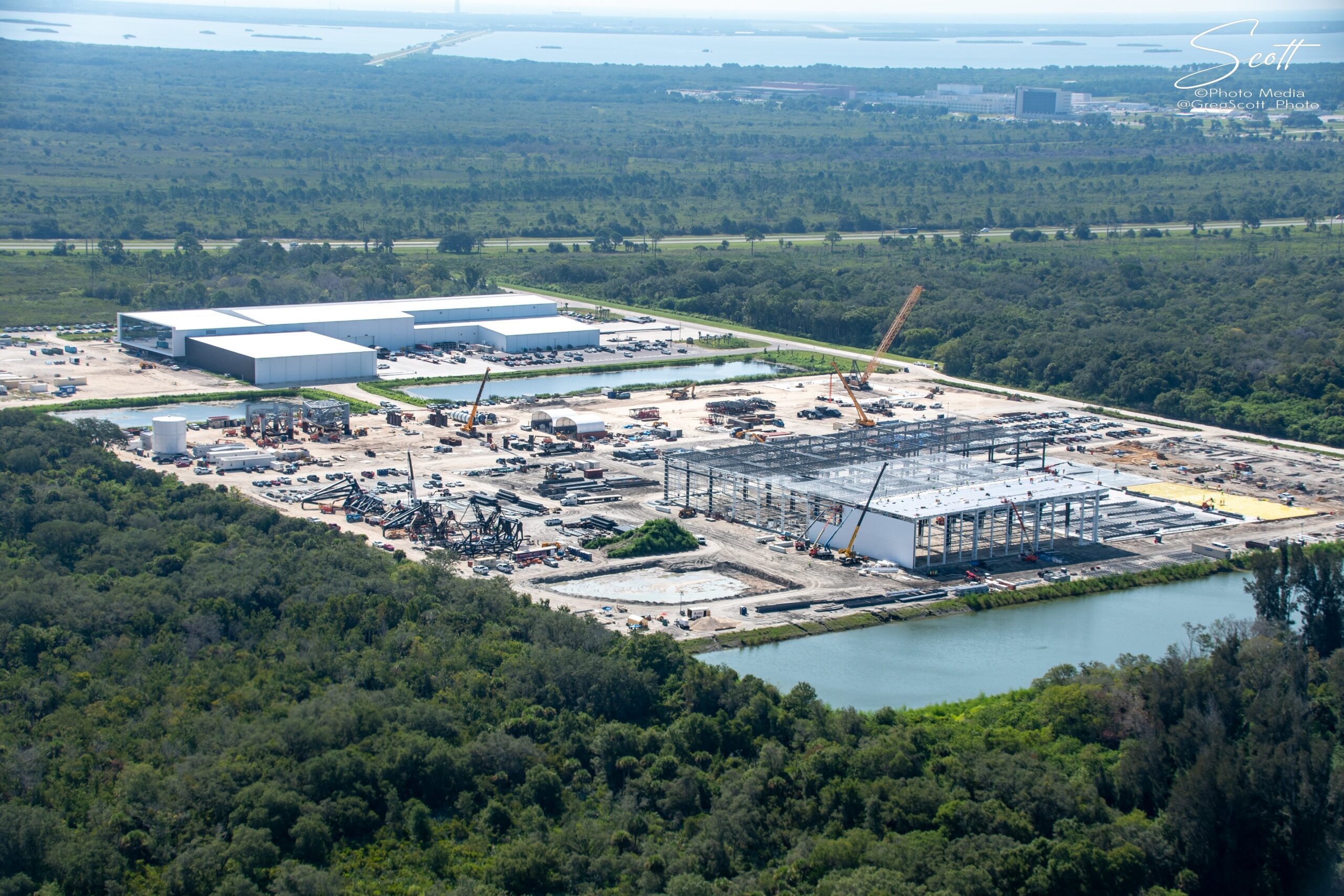 Вот уж где SpaceX развернулась со строительством по-полной, так это во Флориде. Прежде всего, местное здание фабрики тут строят просто потрясающими темпами. Впрочем, оно и неудивительно – в Техасе-то с 20 года были луковичные ангары, где можно работать, а тут на начало этого года было только болото. Теперь на месте болота высится построенная 1-я очередь фабрики, а к ней вплотную уже примыкает 2-я очередь, каркас которой собрали за считанные недели.