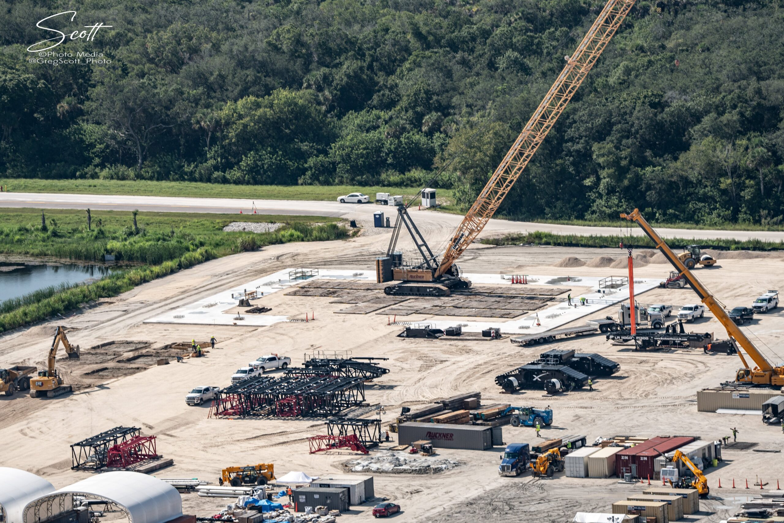Что касается местного MegaBay, то, как я и предполагал, в конце августа начались работы по возведению стен. Для этих целей Маск прикупил еще один тысячетонный гусеничный кран – LR-11000, аналогичный тому, что уже действует в Starbase. Из фундамента выдвинулись конструкции, служащие, судя по всему, основой для пары лифтовых шахт – местный MegaBay изначально будет более продвинутым, чем техасский.