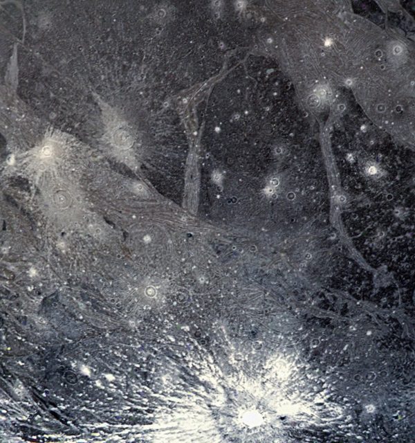 Поверхня найбільшого супутника Юпітера Ганімеда (більшого за Меркурій) має два різні типи ландшафту. Темні ділянки на фото – найстаріші регіони, тоді як світліші – значно молодші області, прорізані заглибленнями та виступами. Яскрава речовина внизу зображення розкидана навсібіч внаслідок відносно недавнього удару.