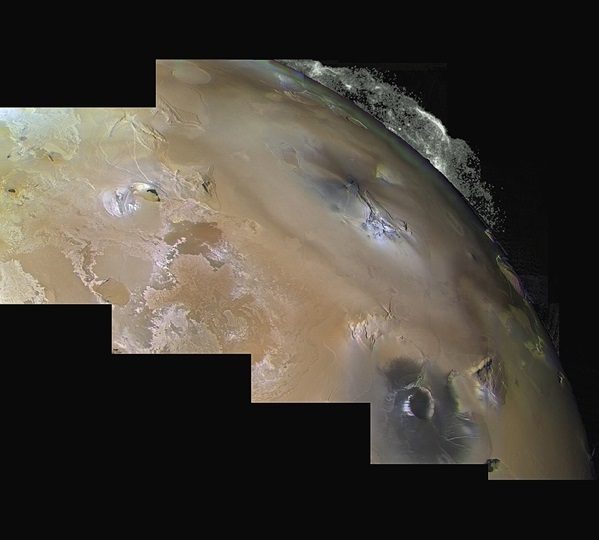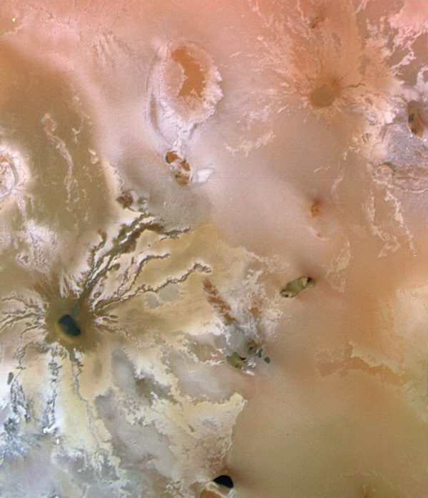 Звивисті «ріки» лави течуть схилами вулкана Ра, розташованого на супутнику Юпітера Іо. Діаметр його кратера становить близько 30 км, а потоки лави простягаються звідти на 250 км. Вершина піднімається лише на 1 км над околицями. Джерело: NASA/JPL