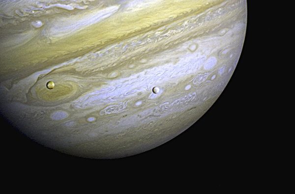 Зображення супутників Юпітера Іо (перед Великою червоною плямою) та Європи на тлі вершин хмар, зроблене «Вояджером-1» 13 лютого 1979 року. Дивне забарвлення Іо яскраво видніється з відстані 20 мільйонів кілометрів. Джерело: NASA/JPL