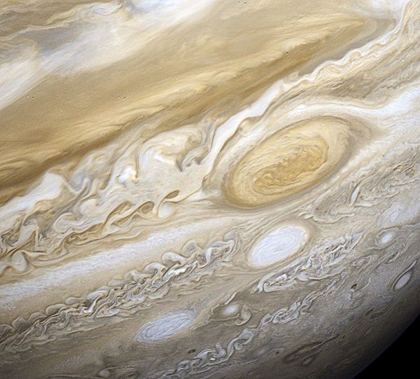 Знімки верхніх шарів кольорових хмар Юпітера, зроблені «Вояджерами», нагадують багатьом полотна художників-імпресіоністів. Найдрібніші деталі у Великій червоній плямі (найпомітніша область на фото, яку утворює велетенський вихор-антициклон) та навколо неї зазнали суттєвих змін упродовж чотирьох місяців між прольотами «Вояджерів-1» і «2».