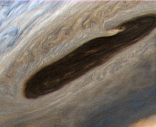 «Вояджери» виявили кілька коричневих овалів в атмосфері Юпітера. Схоже, що це отвори у верхніх шарах хмар, які дозволяють зазирнути у темніші області внизу. Окрім того, можна помітити високу білу хмару, що нависає над північним краєм цього овалу. Джерело: NASA/JPL
