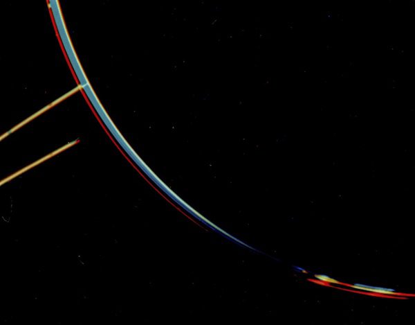 Космічний апарат «Вояджер-1» у березні 1979 року вперше сфотографував слабкі пилові кільця Юпітера під час прольоту повз. Згодом вони «позували» для зонда «Вояджер-2», який зробив це зображення, коли пройшов у тінь планети. Вигнуті кільця виглядають оранжево-червоними, а різнокольорове основне кільце Юпітера можна побачити, застосувавши тривалі експозиції через два фільтри.