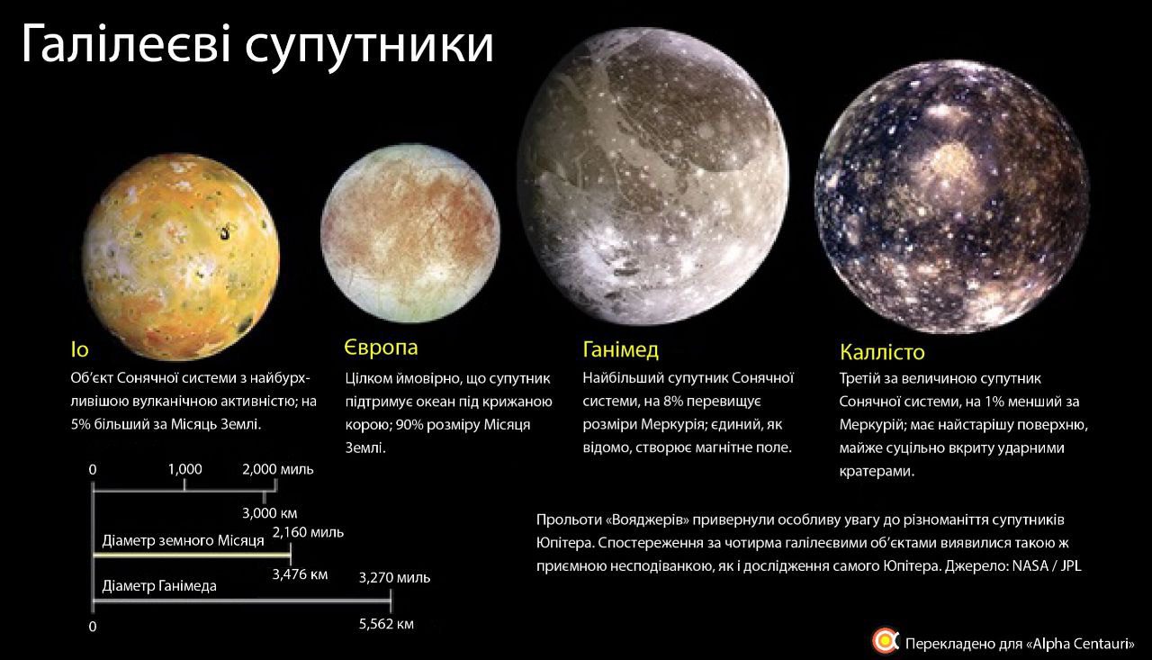 Дивовижна планета заслуговує на дивовижні супутники. Відкриті Галілео Галілеєм у 1610 році, чотири найпотужніших із них Іо, Європа, Ганімед та Каллісто (у порядку віддаленості від планети) не розчаровують та вдало відповідають цьому опису. Ганімед, наймасивніший супутник у Сонячній системі, трохи більший за Меркурій, тоді як Каллісто майже дорівнює діаметру планети. Іо та Європа – розмірами приблизно із земний Місяць.