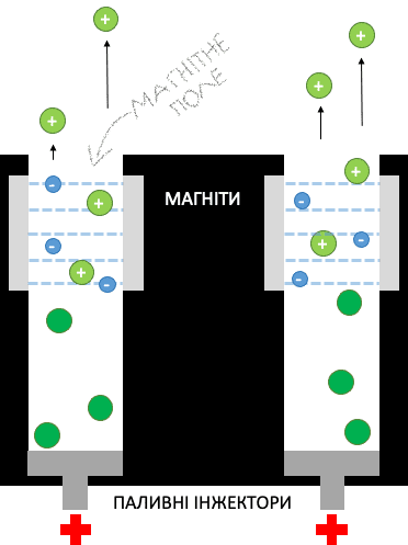 У магнітному полі знаходяться електрони, що вільно рухаються там по круговій траєкторії. Через інжектори в камеру потрапляють молекули палива. Рухаючись вгору, молекули пересікають область магнітного поля. Електрони що рухаються в полі іонізують молекули. Електричне поле створюване інжекторами на дні камери (маючи позитивний потенціал) надає іонам прискорення і виштовхує назовні.