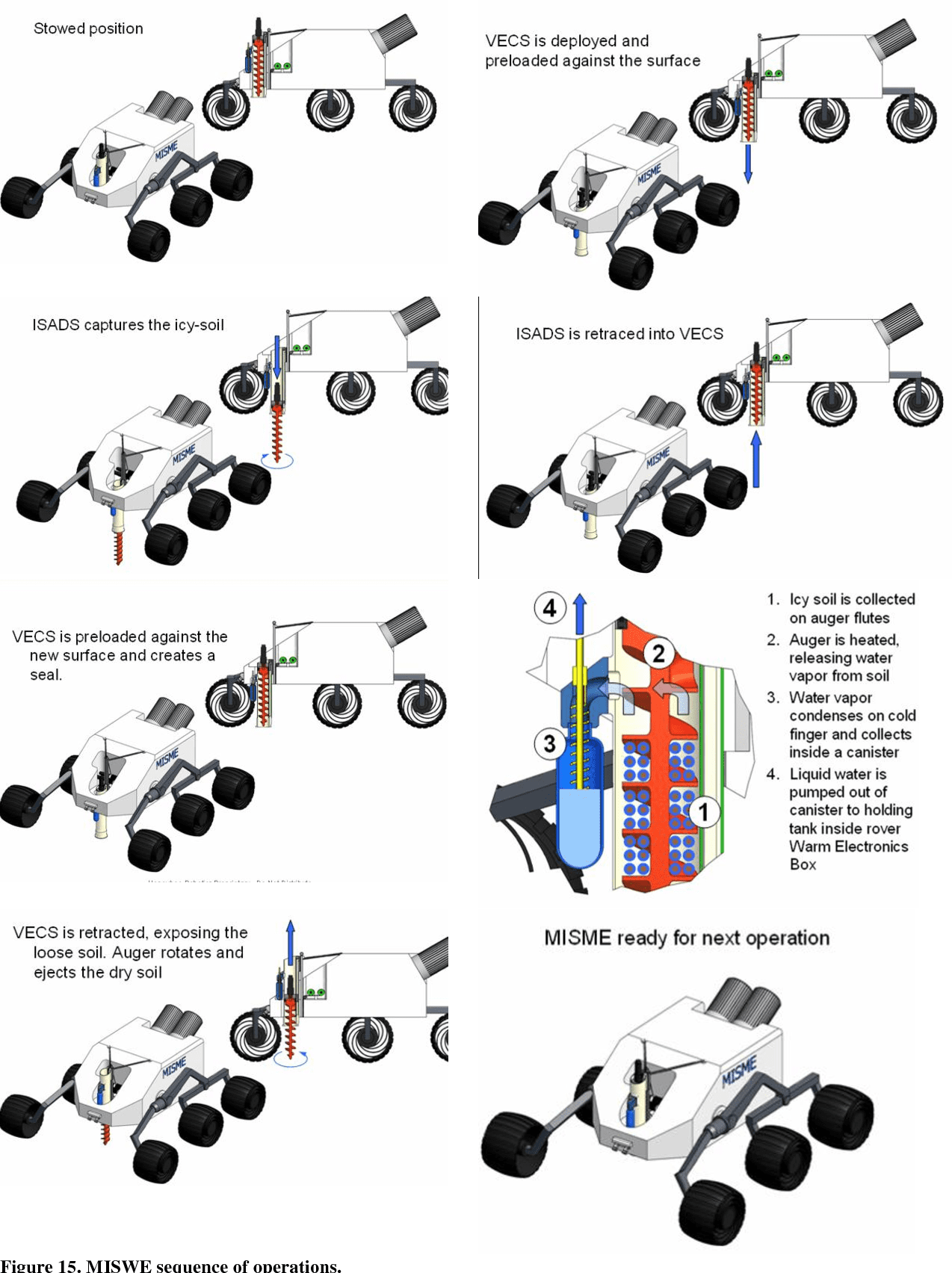 - Він здатний видобувати воду на різних глибинах і в різних місцях у різних формах, включаючи зцементований льодом реголіт, поверхневий іній і гідратовані мінерали. Він також може зробити висновок про наявність води на місці буріння, наприклад, відстежуючи реакцію нагріву реголіту, яка демонструє явне придушення підвищення температури під час сублімації. Це дозволяє системі ідентифікувати та збирати найбагатші поклади H2O.