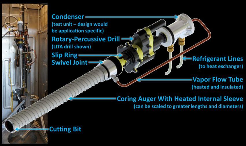 - Він може бути розроблений для використання електричної або теплової енергії для сублімації води та пасивного чи активного відведення тепла від конденсатора. За допомогою правильного вибору матеріалів і геометрії (насамперед довжини та діаметра шнека) систему також можна оптимізувати на основі очікуваної теплопровідності та газопроникності водоносного реголіту. Це дозволяє більш жорстко контролювати температуру та потік газу, дозволяючи гарантувати, що водяна пара ефективно збирається та не виходить із системи чи не осідає на непередбачених поверхнях. Подаючи тепло безпосередньо до дна “штольні” цей підхід також дає змогу звільненій водяній парі з свердловини конвективно нагрівати реголіт на його шляху вгору. Це значно скорочує час і енергію, необхідні для того, щоб тепло досягло відкладень.