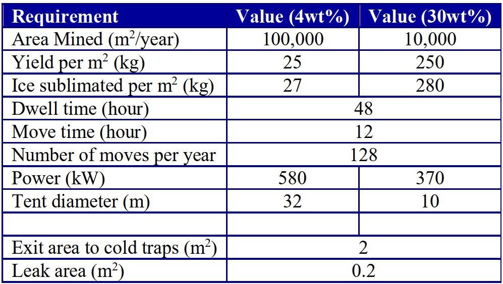 Рішення для визначення масштабності термального видобутку для видобутку води 2450 тонн на рік (з виробленням 1640 тонн палива на рік) показано в наступній таблиці. Термальний видобуток можна масштабувати для досягнення будь-якої цілі видобутку води. Вміст льоду, який можна видобути на площу поверхні, оцінюється в 25 кг/м2 і 250 кг/м2 для регіонів з 4% і 30% відповідно. Рішення включає в себе тенти діаметром 32 м і 10 м знову для регіонів з 4% і 30% відповідно. Один тент необхідно розміщувати 128 разів на рік. Додаткові намети дадуть додаткову маржу. Кількість льодовозів залежить від щільності льоду в КТ, об’єму КТ, швидкості руху льодовоза, відстані між льодовим полем і станцією обробки та часу передачі на станції обробки.