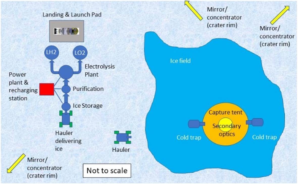 Colorado School of Mines (CSM) розробила систему для роботи в PSR з видобутку та переробки водяного льоду в рідкий кисень LOX і пропелент LH2. Під час термічного видобутку тепло подається безпосередньо на поверхню через геліостати або нагрівальні елементи. Тепло сублімує лід у пару, яка виривається з поверхні. Пара вловлюється куполоподібним тентом, що покриває нагріту поверхню. Далі вона виводяться через отвори в холодильні пастки (CT) за межами тенту, де знову замерзає. Коли СТ заповнюються замороженим льодом, їх виймають і замінюють порожніми СТ. Заповнені льодом СТ транспортуються на завод для переробки в очищену воду, кисень або паливо. Вважається, що всім повинно керуватися дистанційно із Землі.