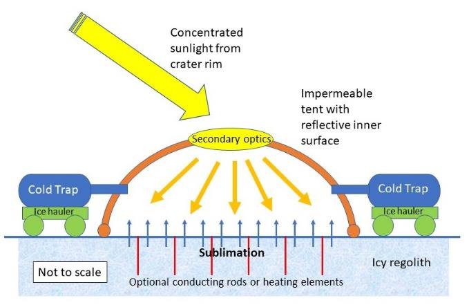 Методи вилучення льоду з постійно затінених областей (PSR) можна згрупувати в два класи: вилучення, засноване на масовому фізичному видаленні крижаного реголіту як твердого матеріалу і вилучення, засноване на сублімації льоду на масці, що дозволяє не переміщати реголіт. Типовими методами розробок є об’ємне розкопування поверхні за допомогою роверів, оснащених ковшами або ковшовими колесами. Вони вимагають транспортування та обробки великих об’ємів реголіту, що підвищує вимоги до маси та потужності збирання льоду в PSR. Методи видобутку, засновані на сублімації льоду безпосередньо з поверхні за допомогою спрямованої енергії, наприклад сонячного світла, мікрохвиль або радіаційних обігрівачей, дозволяють уникнути багатьох недоліків попереднього методу. Сублімація льоду в реголіті супроводжується транспортуванням пари до конденсатора.