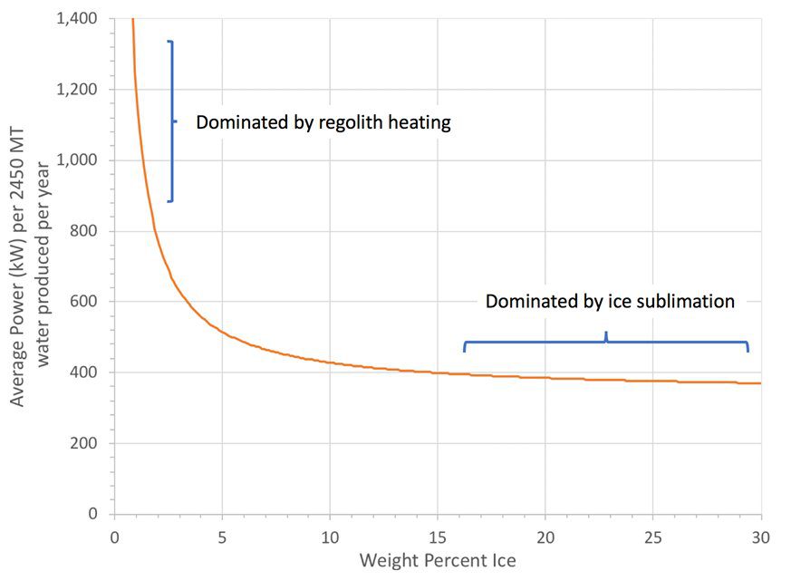 Найоптимістичніша оцінка вмісту водяного льоду на Місяці в PSR отримана від місії LCROSS становить 5,5% ваги льоду, тоді як за іншими оцінками вміст льоду становить 10% ваги, а за найбільш песимістичними оцінками – 1% ваги. Це свідчить про те, що процес термічного видобутку має відбуватися в місці з вмістом льоду понад 4 мас.%. Недавній повторний аналіз даних місії виявив області з >30% льоду. При 30% льоду потужність, необхідна для сублімації крижаного матеріалу реголіту, на 33% менша, ніж потужність, необхідна при 4% льоду, і лише на 10% більша, ніж потужність, необхідна для сублімації чистого льоду.