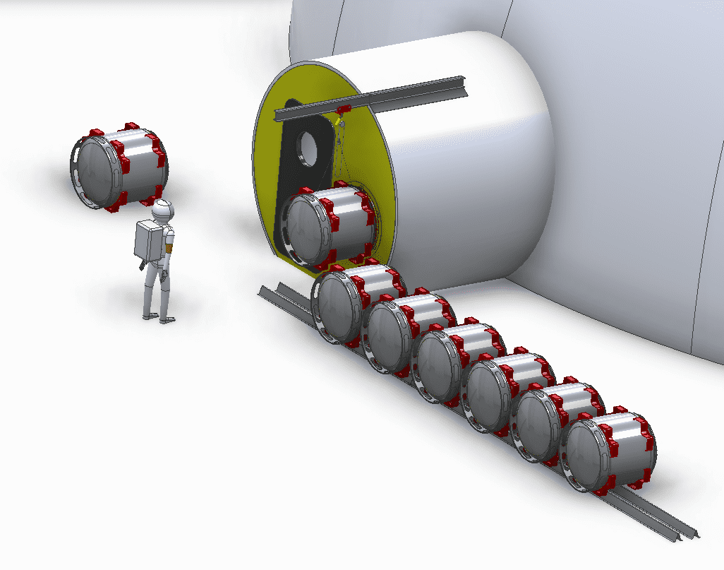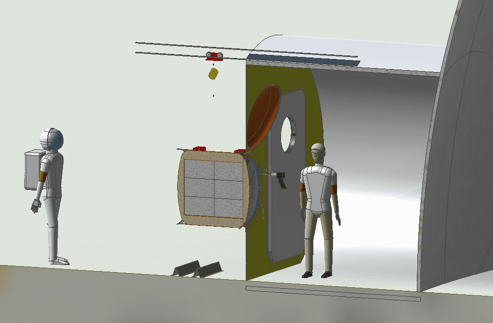 Інтерфейси. Бажано, щоб контейнери не виносили в навколишнє середовище, щоб розпакувати їх, оскільки для цього знадобиться екіпаж для очищення зовнішньої частини контейнера від місячного пилу. Для цього повинен бути люк розміром 67 см x 47 см, щоб забезпечити можливість переміщення товарів шляхом з’єднання контейнера з середовищем “рукава”, до марсоходу або середовища проживання.