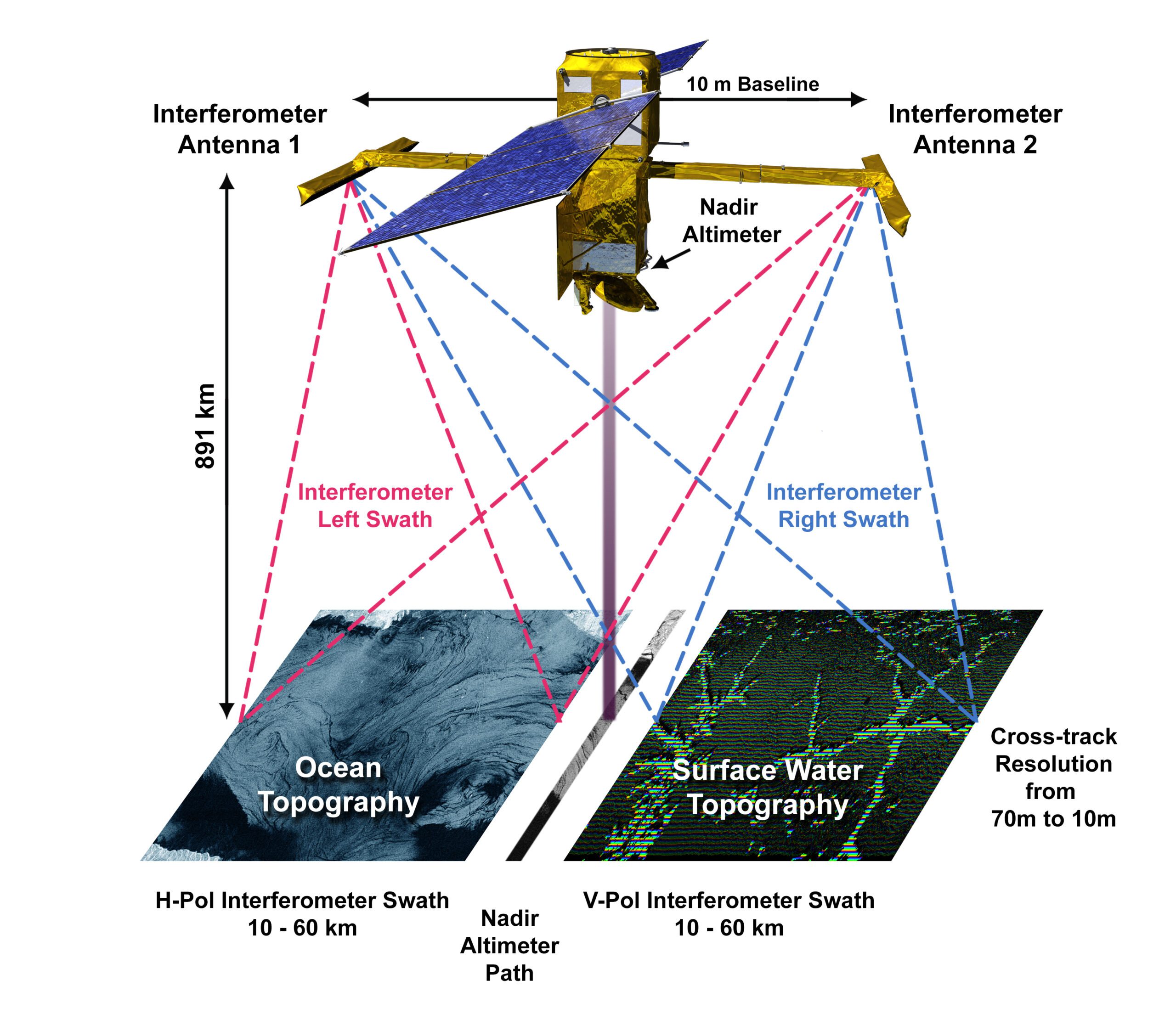 SWOT вимірюватиме понад 90% поверхні води на Землі, скануючи планету між 78° північної широти та 78° південної широти з точністю до 1′ та повторюючи той самий шлях кожен 21 день. Досягнення такого рівня точності з висоти в 554 милі (891 кілометр) вимагає, щоб штанга, яка використовує радар для вимірювання висоти води, залишалася стабільною в межах 2 мікрон – або приблизно 3% товщини людської волосини.