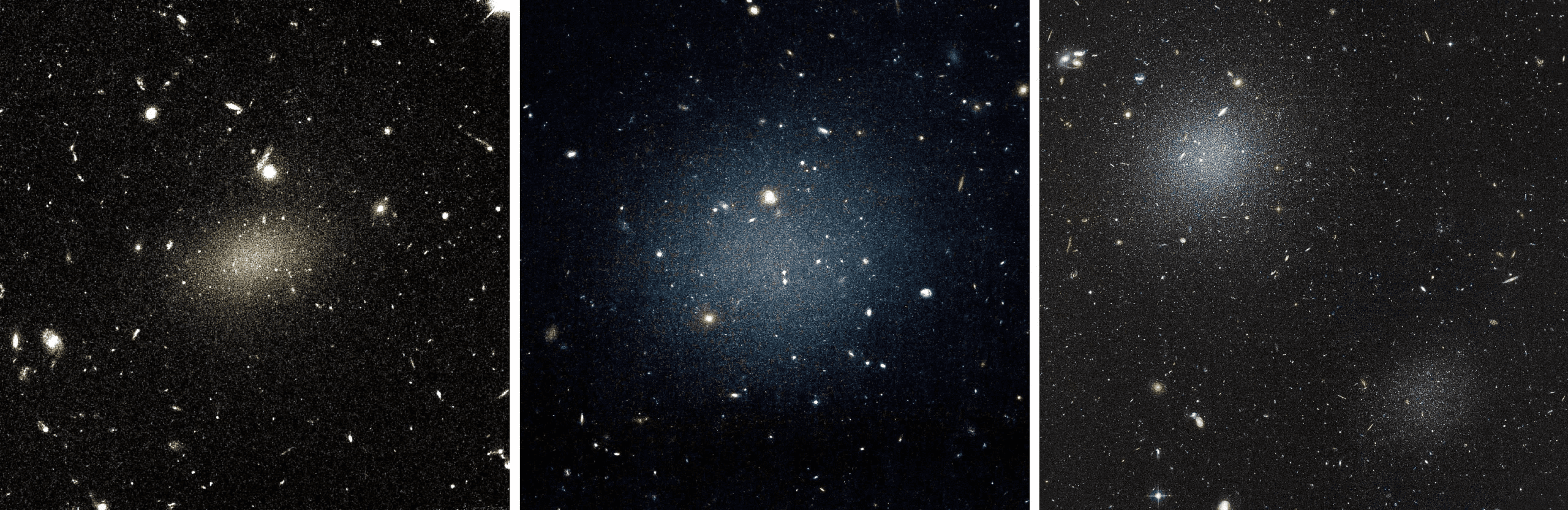 В некоторых недавно обнаруженных галактиках полностью отсутствует тёмная материя. Группа Ван Доккума идентифицировала одну такую галактику в 2018 году, а затем заметила рядом следы других. В мае этого года команда опубликовала в журнале Nature гипотезу, что эти следы образовались в результате давнего столкновения двух галактик. Столкновение замедлило поток их газа, но тёмная материя продолжала двигаться, как будто ничего не произошло. Затем газ преобразовался в сгустки звёзд, в конечном итоге сформировав цепочку галактик, свободных от тёмной материи.