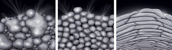 Последующие миссии к кометам Хартли (103P/Хартли) и Чурюмова-Герасименко, по всей видимости, выявили доказательства другого процесса формирования. Многочисленный ореол обломков, окружающий 103P, содержал объекты размером до 30 сантиметров в диаметре. Некоторые исследователи предположили, что они представляют собой мелкие камешки, из которых собрано ядро кометы. Rosetta обнаружила похожую ситуацию на комете Чурюмова-Герасименко, где метровые «мурашки» на стенах эродированных ям на поверхности, по-видимому, являются примерами строительного материала, из которого состоит комета. Также при изучении Чурюмова-Герасименко наблюдатели нанесли на карту то, что, вероятно, представляло собой последовательность слоёв на поверхности, которые обнажались по мере эволюции кометы. Некоторые учёные предположили, что они были свидетельством её образования в результате компрессии от столкновений.