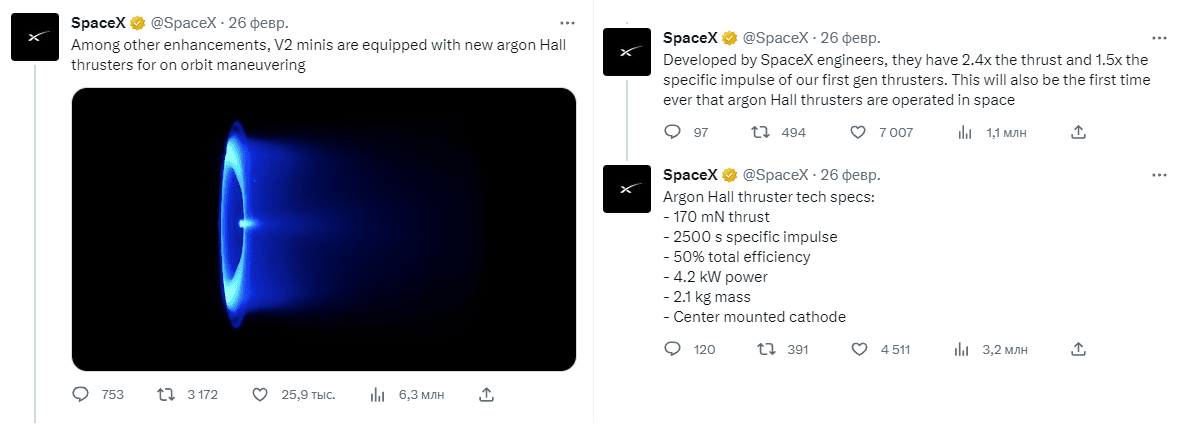 Новые спутники обладают в 4 раза более высокой пропускной способностью, а так же используют новые движки – на сей раз Маск вновь всех удивил, и пока некоторые заявляют о готовности перейти с безумно дорогого ксенона на менее дорогой криптон, спейсы перешли на дешевый аргон. В процессе заправки 4000 спутников, по некоторым подсчетам, SpaceX сэкономила около полумиллиарда долларов благодаря криптону. Теперь же, учитывая габариты и количество спутников 2-го поколения, вероятно, сэкономят еще столько же или даже больше за счет перехода на аргон.