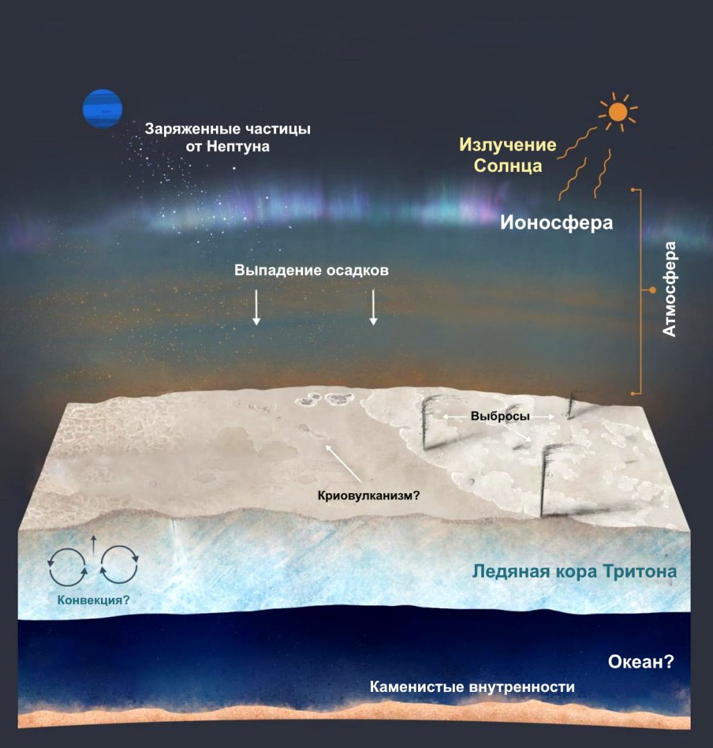 Невероятные выбросы, обнаруженные зондом Voyager, характерны для южного полярного региона, богатого летучими веществами. Согласно общепринятой теории, они возникают в результате взрывного выброса тёмного вещества из-под прозрачного льда, однако согласия относительно точной причины этого явления нет. Более новая теория гласит, что Тритон может иметь подповерхностный океан, подобный таковому на спутнике Сатурна Энцеладе, на котором также наблюдались похожие выбросы. Если она окажется верной, то это может иметь значительные последствия для поиска жизни во Вселенной.