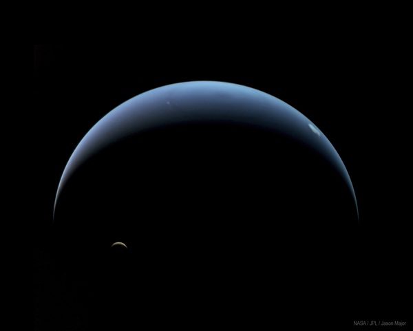 Вояджер 2 зафільмував Тритон на фоні Нептуна. Місія Trident (з англ. «Тризуб») зможе спостерігати Тритон у сонячному та відбитому від Нептуна світлі. Джерело: NASA/JPL-Caltech/Jason Major