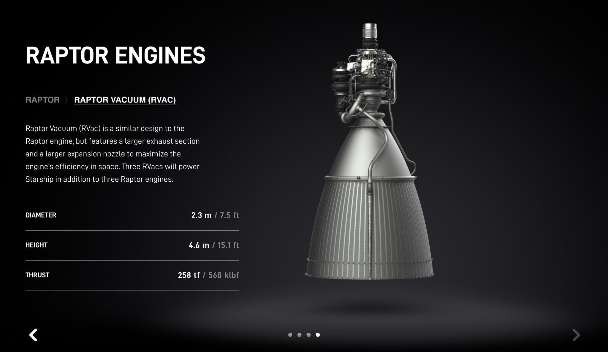 При том, что характеристики обычного, атмосферного двигателя уже давно известны, в частности тяга Raptor 2 в 230 тонн озвучивалась уже неоднократно, то теперь известна тяга (а заодно и габариты) его вакуумного собрата – 258 тонн. То, что она выше – очевидно, ведь в атмосфера не мешает, и можно сделать сопло большего диаметра. Попутно улучшается и импульс, но тут официальных данных пока нет, но по ранее озвученной информации, это 327с. для обычного на уровне моря и где-то в диапазоне 360-380c. в вакууме.