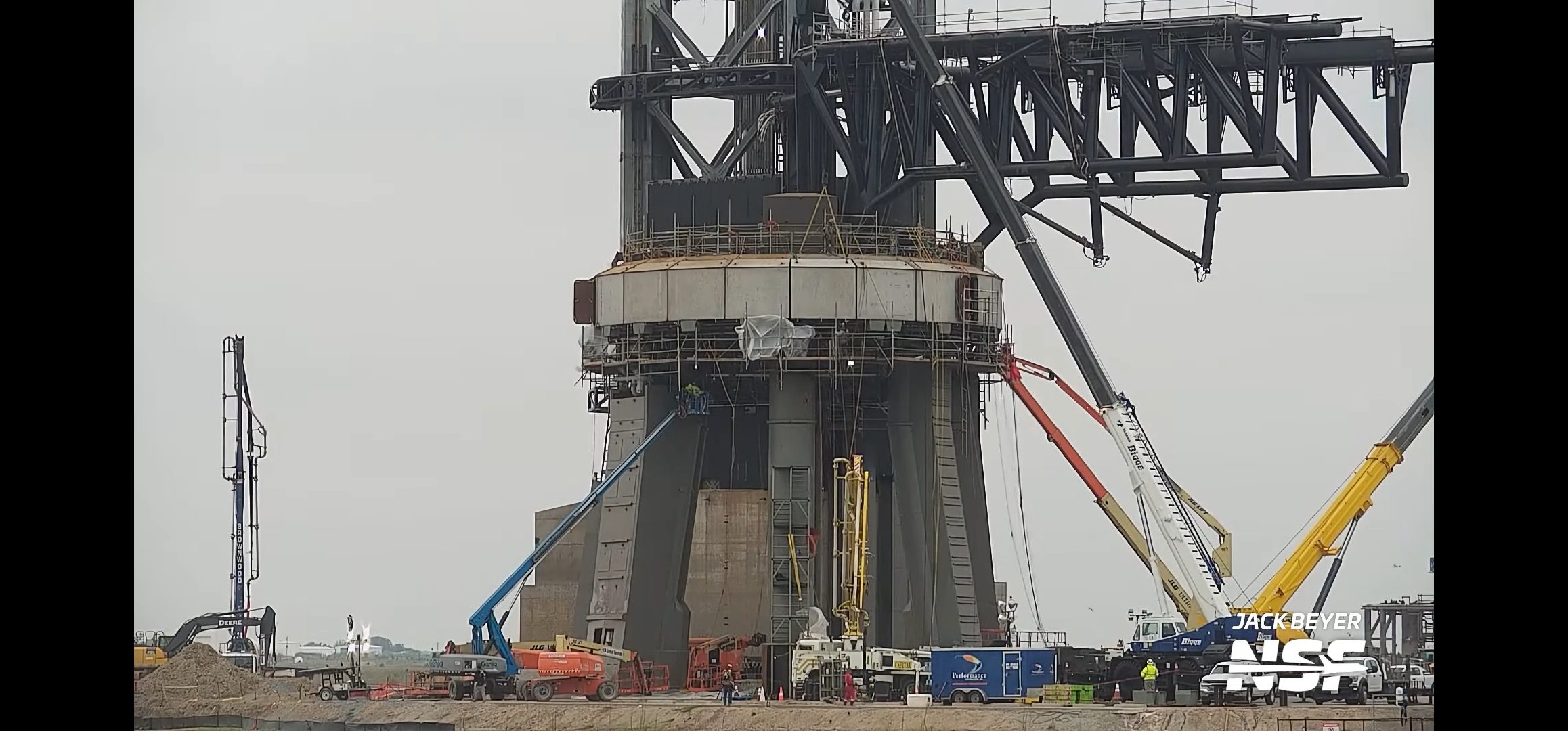 Наконец, что там творится с Ship 24 и Booster 7. В начале месяца ускоритель сняли со стартового стола. Это было сделано для того, чтобы он не мешал проводить работы по доводке стартовой площадки до нужных кондиций. Прежде всего, стартовый стол по периметру обшили бронелистами. Защиту добавили и на оставшуюся незащищенной нижнюю часть заправочной штанги ускорителя. Заправку для Starship тоже обслуживали, но к концу месяца сняли в нее конструкции, обеспечивающие доступ. Иначе говоря, всерьез готовятся к старту.