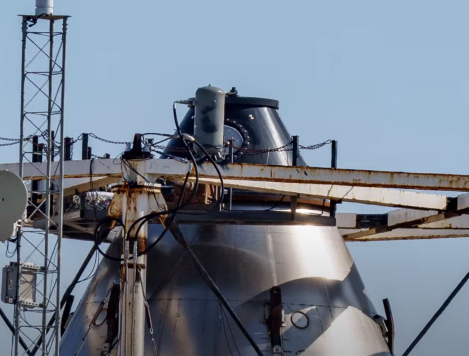 Теперь про испытания. Для начала – Ship 25, являющийся sistership-ом для 24-го, начали испытывать на новом полигоне Месси. Эта площадка примечательна тем, что находится в удалении от дорог, и для проведения испытаний не требуется дополнительных разрешений. Там же находится и очередной тестовый обтекатель, упрятанный в “клетку” для проведения нагрузочных тестов.