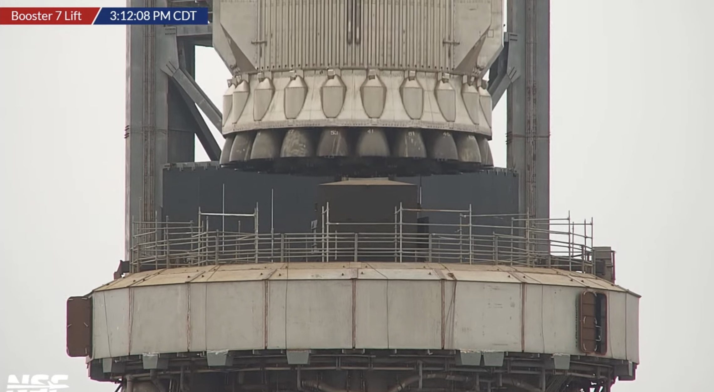 И ближе к концу месяца, похоже, все работы над стартовым столом, по крайней мере, в верхней его части, были завершены, и Booster 7 занял на нем свое почетное место. Перед этим успели провести тесты системы разгона боковых двигателей и работу заправочной системы ускорителя.