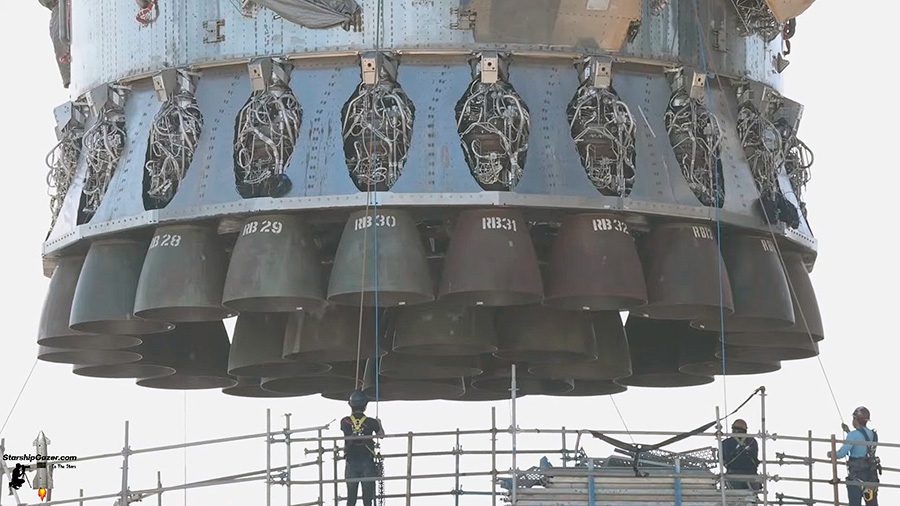 Блок двигунів Raptor 2 на першому ступеню SpaceX Starship © Фото StarshipGazer.com