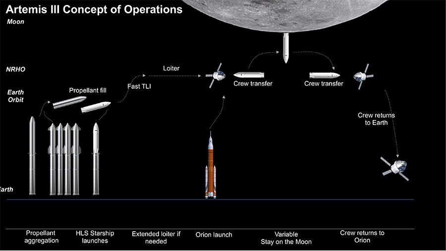 Поки є лише одна «стороння» програма, де заплановане використання SpaceX Starship – місячна програма Artemis. Точніше, місії Artemis III/IV з висадкою астронавтів на Місяць, де Starship працюватиме спільно з SLS. У рамках Artemis III/IV повинні паралельно використати дві різні системи – SLS з кораблем Orion MPCV і Starship з посадковим модулем Human Landing System (HLS). Планується, що спочатку за допомогою Starship виводиться на навколоземну орбіту блок заправки для HLS, потім здійснюється його дозаправляння (кілька рейсів Starship-«танкерів»). Місія Artemis III поки що запланована на грудень 2025 року, але через гальмування всіх стадій місячної програми (від впровадження нових ракет-носіїв до запуску орбітальної станції Lunar Gateway) терміни Artemis III/IV можуть легко «з’їхати» на 2026-2028 роки. Плюс залишається відкритим питання, на якій стадії зараз перебуває проєкт посадкового модуля Starship Human Landing System від SpaceX…