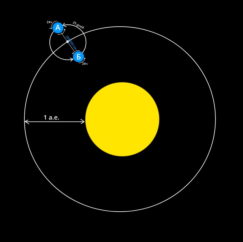 Насколько я понял, почитав вики, в реальности подобных систем обнаружено не было. У нас есть системы Земля-Луна и Плутон-Харон, которые хоть и похожи, но не удовлетворяют требованиям к термину “двойная планета”. Но давайте сделаем допущение, что описанная мною выше система каким-то чудом могла возникнуть.