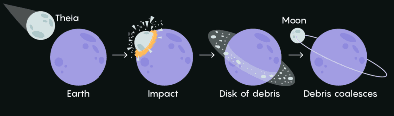 Формирование Луны в результате импактного события согласно современным представлениям. Источник изображения: https://upload.wikimedia.org/wikipedia/commons/1/1f/Moon_-Giant_Impact_Hypothesis-_Simple_model.png