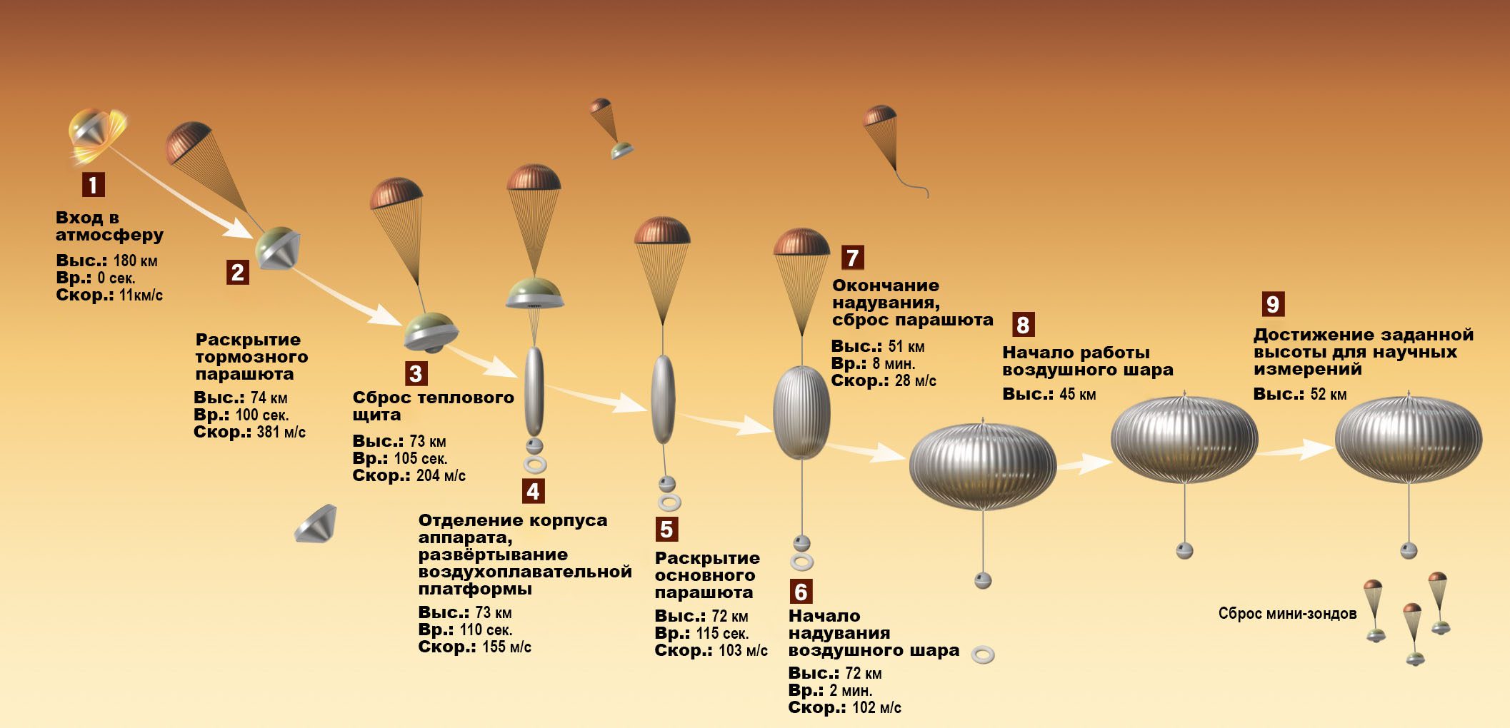 Эта инфографика иллюстрирует, как аппарат с воздушным шаром входит в атмосферу Венеры (слева), замедляется, используя парашют, перед тем как надуть сам шар (в середине) и позднее запустить атмосферные мини-зонды (справа). Текущая концепция миссии предполагает, что воздушный шар будет работать в течение одной недели на высоте 52 километров. Изображение: Astronomy: Roen Kelly, After Seager, S.; Petkowski, J.J.; Carr, C.E.; Grinspoon, D.H.; Ehlmann, B.L.; Saikia, S.J.; Agrawal, R.; Buchanan, W.P.; Weber, M.U.; French, R.; Et Al. Venus Life Finder Missions Motivation and Summary. Aerospace 2022, 9, 385. Https://Doi.Org/10.3390/ Aerospace9070385 (Cc By 4.0)
