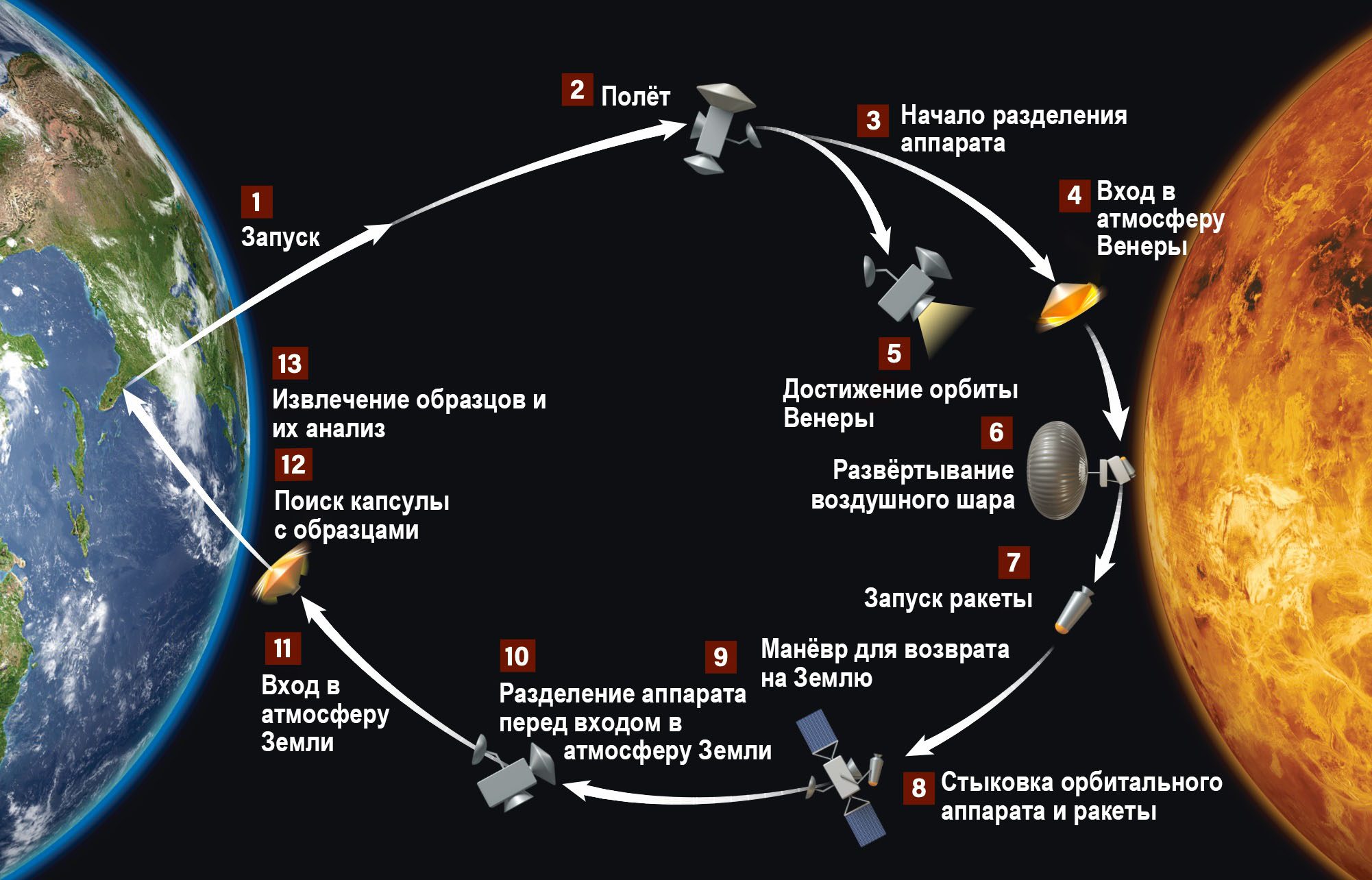 Самая амбициозная и нескорая миссия по отправке образцов с Венеры предполагает круговой маршрут между нашими планетами, сбор образца капель облаков при помощи воздушного шара, а затем их отправку в ракете для стыковки с орбитальным космическим аппаратом, который затем вернётся на Землю со своим драгоценным грузом. Изображение: Astronomy: Roen Kelly, After Seager, S.; Petkowski, J.J.; Carr, C.E.; Grinspoon, D.H.; Ehlmann, B.L.; Saikia, S.J.; Agrawal, R.; Buchanan, W.P.; Weber, M.U.; French, R.; Et Al. Venus Life Finder Missions Motivation and Summary. Aerospace 2022, 9, 385. Https:// Doi.Org/10.3390/Aerospace9070385 (Cc By 4.0)