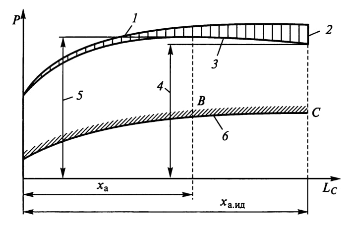 Вкупі з тим, що в цьому районі сопла тиск газів (який діє на цю проєкцію і тим самим створює тягу) уже геть малий, тяга, створювана проміжком ВС також є невеликою (лінія 1).